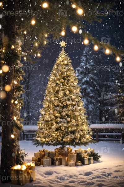 Фея Рождественская елка светит теплыми фейриными огнями с золотым декором в лесу зимой со снегом, коробки с подарками лежат под елой.Рождество и Новый год, праздничное настроение, поздравительная открытка