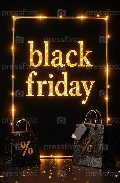 Неоновые светящиеся золотые буквы "Черная пятница" на черном фоне. витрина магазина для Черной пятницы, распродажи, скидки, сумки для покупок, созданные ИИ