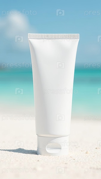 Белая трубка макет солнцезащитного крема на белом песке пляжа на фоне синего океана. Ультрафиолетовая защита кожи, солнцезащитный крем. ИИ генерируется