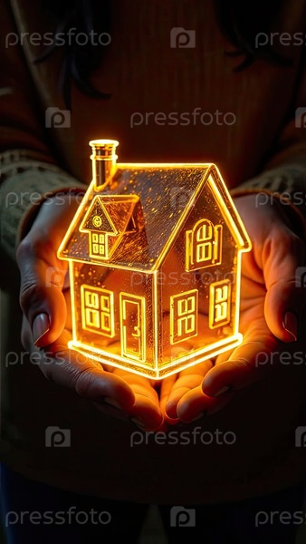 Золото светящийся символ уютного дома В ладонях рук с золотым блеском. Недвижимость, риэлтор, ипотека, страхование, бронирование, изоляция, мечта о собственном доме. ИИ генерируется