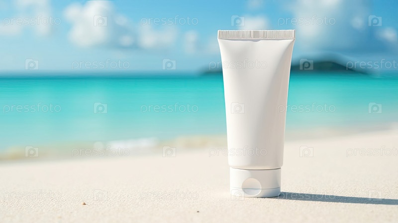 Белая трубка макет солнцезащитного крема на белом песке пляжа на фоне синего океана. Ультрафиолетовая защита кожи, солнцезащитный крем. ИИ генерируется