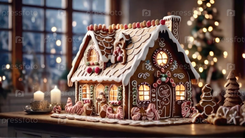 Традиционный дом с имбирем в рождественском декоре и фейриные огни на новогоднем фоне. вкусная ароматная сладость, домашние торты, комфорт в доме, интерьер дома. ИИ генерируется