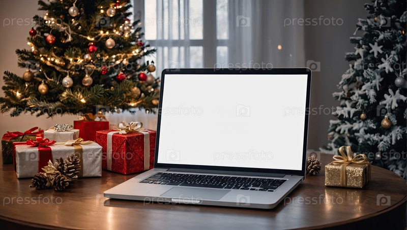Ноутбук с белым экраном макет на столе в уютном домашнем офисе рождественского декора в стиле лофт