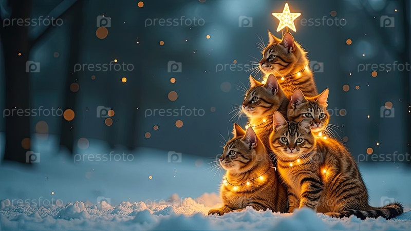 Рождественская елка из кошек, сделанная на праздничном снежном фоне с блеском, многоцветные сотни кошек складываются в форме высокой рождественской елки с золотыми светящимися гирляндными огнями