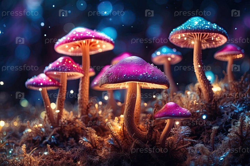 Группа волшебных грибов, биолюминесцентные капсулы, галлюциногенные споры псилоцибина, психоактивный опыт, наркомания