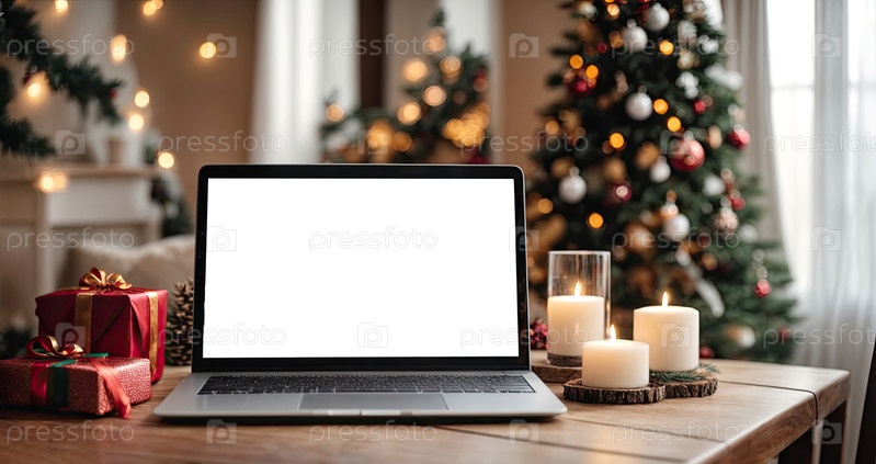 Ноутбук с белым экраном макет на столе на фоне рождественского декора комнаты с елкой, фейриными огнями, уютной комнатой