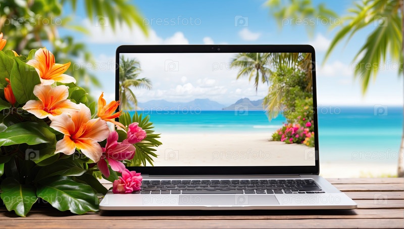Современное рабочее пространство для фрилансеров, удаленный ноутбук, море, цветы, пальмы, синий горизонт, пустой экран и белое копирование бизнес-текста