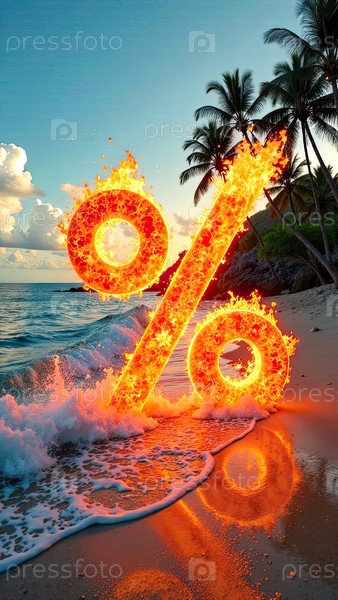 Огненный горящий знак процент на берегу моря с тропическими пальмами в свете солнца, фон заката океана. жаркая летняя распродажа и скидки, горящий тур-баннер, флаер. ИИ генерируется
