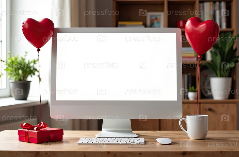 Компьютерный монитор с белым экраном макет на столе в уютном домашнем офисе с красными шарами в форме сердца, подарок, горшочные растения, книжная полка. День святого Валентина подарок, дата, романтика. ИИ генерируется