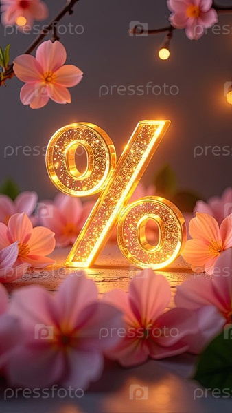 Неон светящийся золотой процентный знак на фоне розового цветения, блеска и лепестков. весенняя распродажа и скидки, 8 марта, Пасха, баннер женского дня, флаер с копировальным пространством. ИИ генерируется