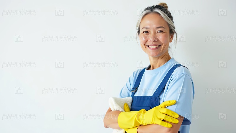 Портрет взрослой азиатской женщины в синем фартуке и желтых резиновых перчатках с тряпкой в руке возле белой стены со свободным местом для текста, услуги очистки окон, уборки дома, горничной