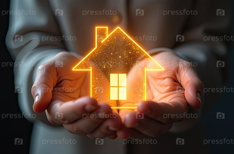 Золото светящийся символ уютного дома В ладонях рук с золотым блеском. Недвижимость, риэлтор, ипотека, страхование, бронирование, изоляция, мечта о собственном доме. ИИ генерируется