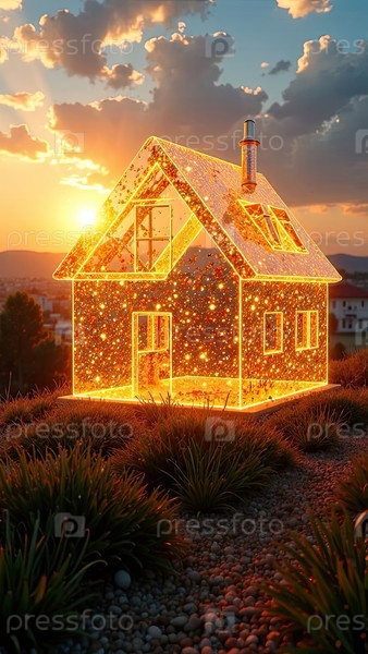 Прозрачное золото светящийся проект дома в натуральном размере на земельной площади. недвижимость, риэлтор, ипотека, страхование, здания, строительство, изоляция, отопление. ИИ генерируется