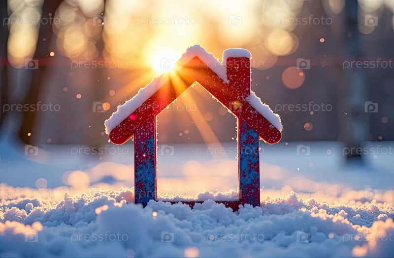 Уютный каркас крошечный дом на снегу и заснеженном фоне в солнечных лучах, с рождественским декором. недвижимость, риэлторская деятельность, ипотека, страхование, бронирование, зимовка, изоляция, отопление. ИИ генерируется