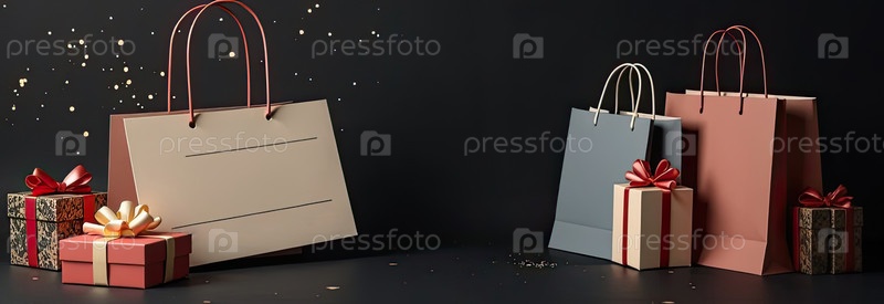 Ценник с пространством для текста на черном фоне. Покупки и скидки, распродажа в Черную пятницу, сумки покупок, подарочная коробка. баннер, флаер. ИИ генерируется