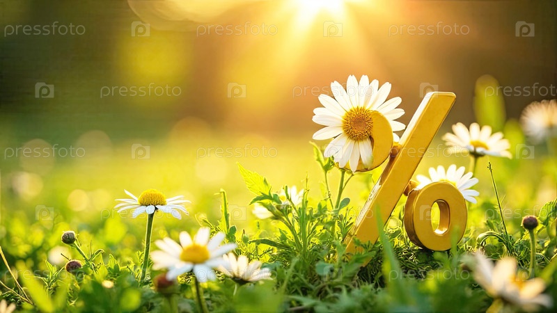 Процентный знак в солнечных лучах, украшен летними цветами. Летняя распродажа и скидки, экология, чистая природа, баннер летнего времени, флаер с копировальным пространством. ИИ генерируется