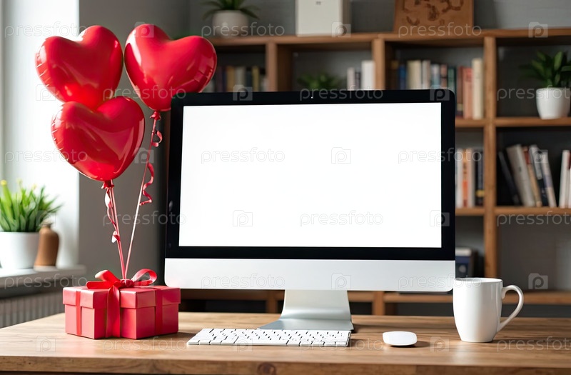 Компьютерный монитор с белым экраном макет на столе в уютном домашнем офисе с красными шарами в форме сердца, подарок, горшочные растения, книжная полка. День святого Валентина подарок, дата, романтика. ИИ генерируется