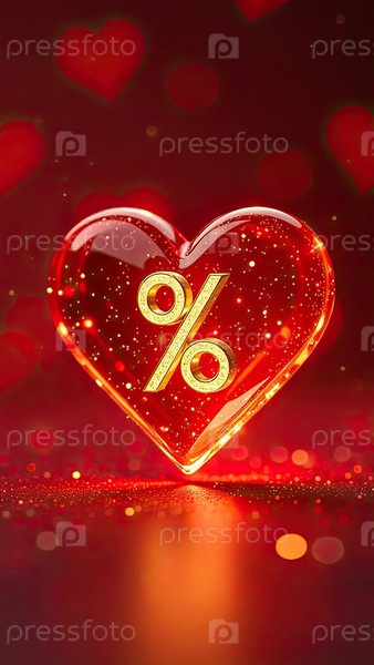Неон светящийся золотой процентный знак на Святого Валентина красный фон любви с красным сердцем, блеск. распродажа святого Валентина, скидки. баннер, флаер со копировальным пространством. ИИ генерируется