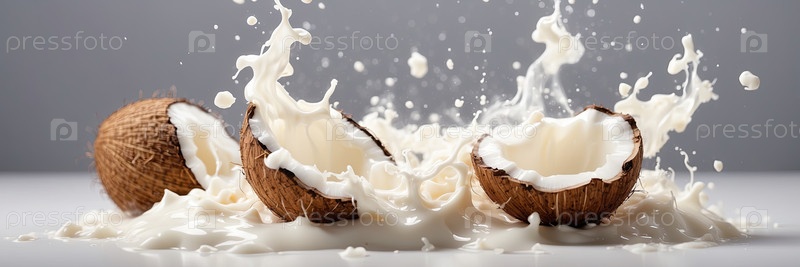 Плески кокосового молока, выплескавшиеся из кокоса в ближайшем кадре на сером фоне
