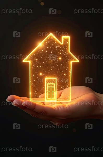 Золото светящийся символ уютного дома В ладонях рук с золотым блеском. Недвижимость, риэлтор, ипотека, страхование, бронирование, изоляция, мечта о собственном доме. ИИ генерируется