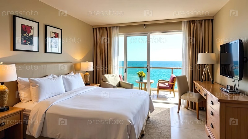 Интерьер гостиничного номера с видом на океан для пляжного отдыха и путешествий