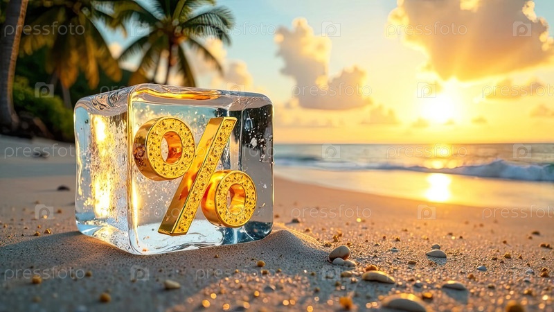 Неон светящийся золотой процентный знак в кубике льда на берегу моря с тропическими пальмами при солнечном свете, туристический фон. Горячая летняя распродажа и скидки, горячий баннер тура, флаер. ИИ генерируется