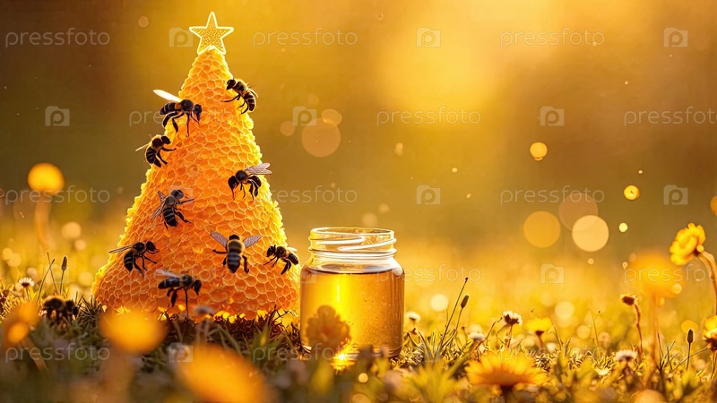 Мед в сосудах в форме конуса рождественской елки с пчелами на летнем поле под солнечным светом.Пчеловодство, Рождество, Новый год.Искусственный интеллект создан