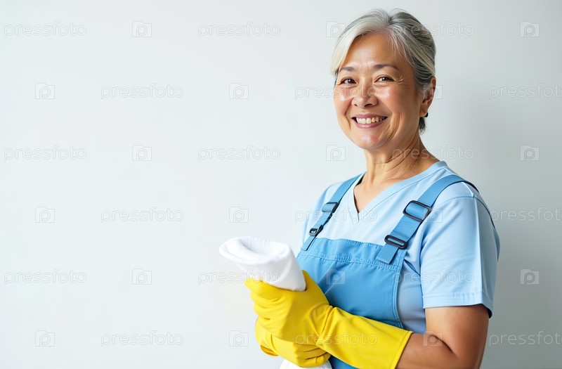 Портрет взрослой азиатской женщины в синем фартуке и желтых резиновых перчатках с тряпкой в руке возле белой стены со свободным местом для текста, услуги очистки окон, уборки дома, горничной