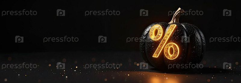 Золотой светящийся процентный знак с тыквой на черном фоне со свободным местом для текста. Осенние распродажи и скидки, баннер Harvest и Halloween, флаер с пространством для копирования. ИИ генерируется
