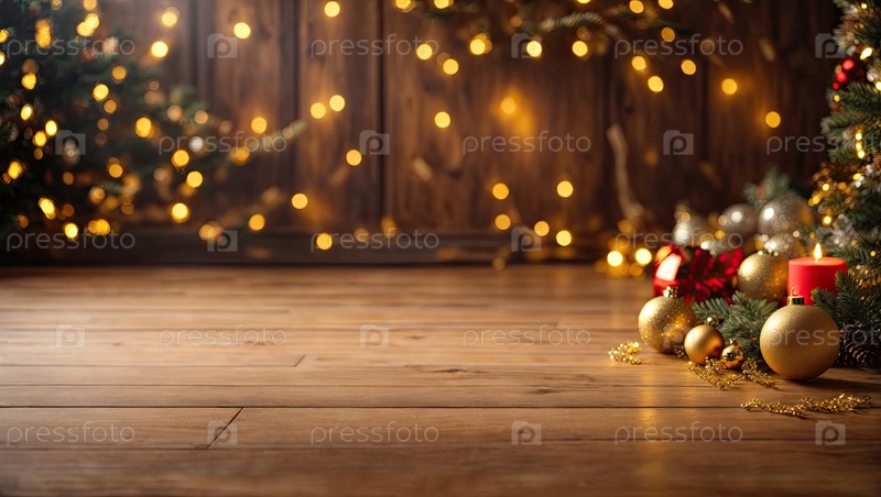 Пустой деревянный пол в коричневых и золотых тонах для отображения продукции со стеной во внутренней части комнаты, с рождественским декором. Копирование пространства, Рождество и Новый год. ИИ генерируется