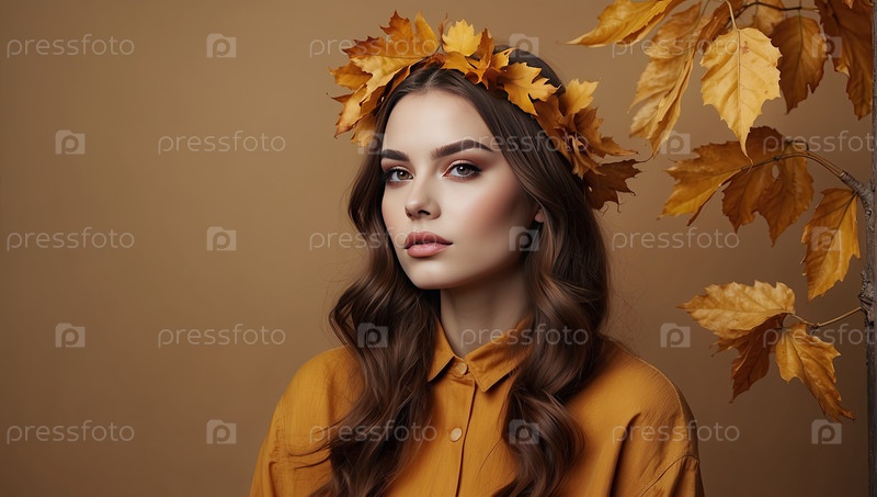 Белая женщина в желтом гардеробе с коричневыми листьями, портрет осенней красоты, уютный стиль, весеннее вдохновение