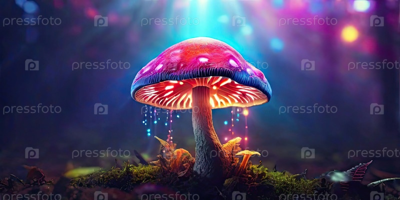 Одинокий психоделический гриб, светящаяся шапка, фантазия о псилоцибине, тонкие галлюцинации, риск наркотиков, зачарованный мир и галлюциногенные состояния ума