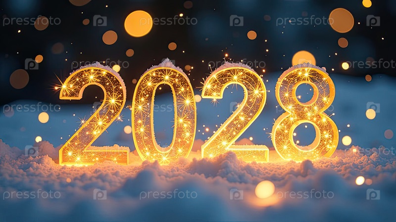 Прозрачные золотые светящиеся числа 2028 на снежном фоне Нового года с золотистыми гирляндами боке, секины, звезды, снег, блеск. Поздравления, открытка. Календарь, обложка. AI generated