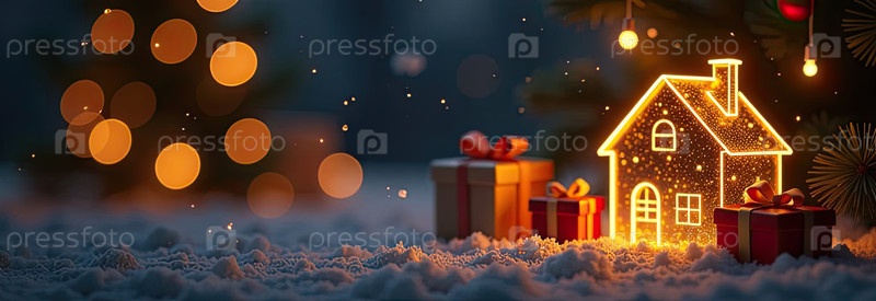 Прозрачное золото светящийся символ дома и коробка для подарков под елкой на рождественском фоне с золотым блеском