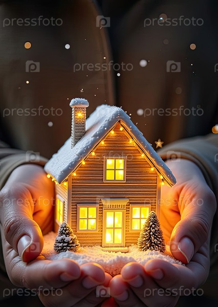 Золото светящийся символ уютного дома на снегу В ладонях рук с золотым блеском. Недвижимость, риэлтор, ипотека, страхование, бронирование, зимовка, изоляция, отопление. ИИ генерируется