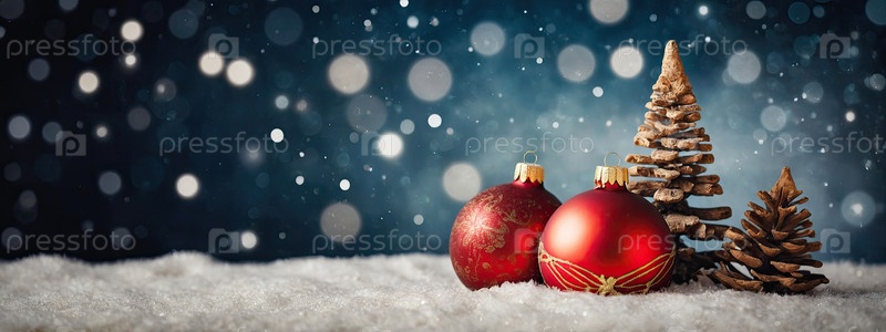 Рождественская открытка с кописпейсом на праздничном снежном фоне с елкой, рождественскими шарами, свечами, конусами и блеском