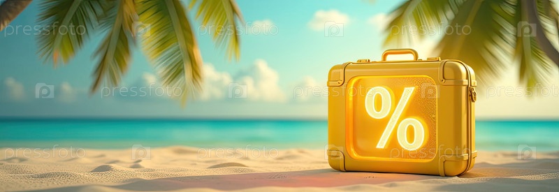 Золотой светящийся знак процент И желтый чемодан на берегу моря с тропическими пальмами под ярким солнцем, океанический закат в фоне. Горячие летние распродажи и скидки, горячий туристический баннер, листовка. AI генерируется