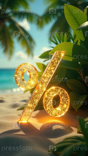 Яркий золотой процентный знак на берегу моря с тропическими пальмами в свете солнца, туристический морской фон. жаркая летняя распродажа и скидки, горящий тур-баннер, флаер. ИИ генерируется