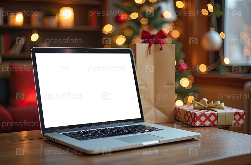 Ноутбук с белым экраном макет на столе на фоне рождественского декора уютного помещения с елкой, фейриными огнями