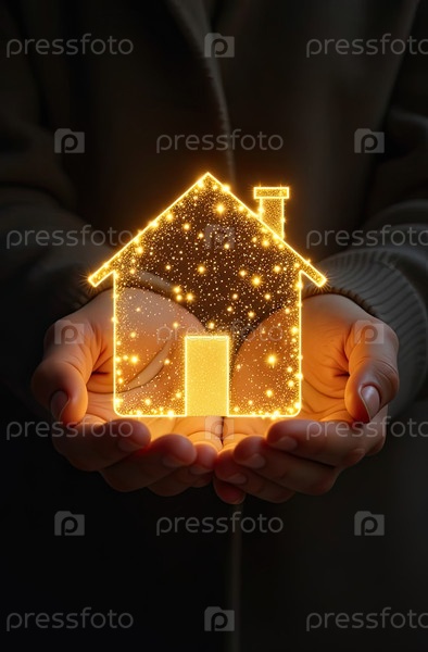 Золото светящийся символ уютного дома В ладонях рук с золотым блеском. Недвижимость, риэлтор, ипотека, страхование, бронирование, изоляция, мечта о собственном доме. ИИ генерируется