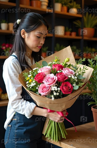 Букет роз и весенних цветов в руках флориста, упакованный в крафт-бумагу в интерьере цветочного магазина, доставка на праздник.Весна, 8 марта, женский день, день рождения. ИИ сгенерировано