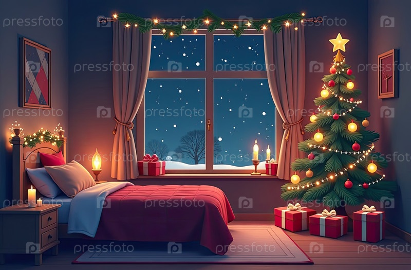 Уютная спальня с кроватью у окна с рождественским декором и елкой, теплыми гирляндами света и свечами - вид изнутри зимой и снегом. Отпразднуйте Рождество и Новый год, рождественское настроение. ИИ генерируется