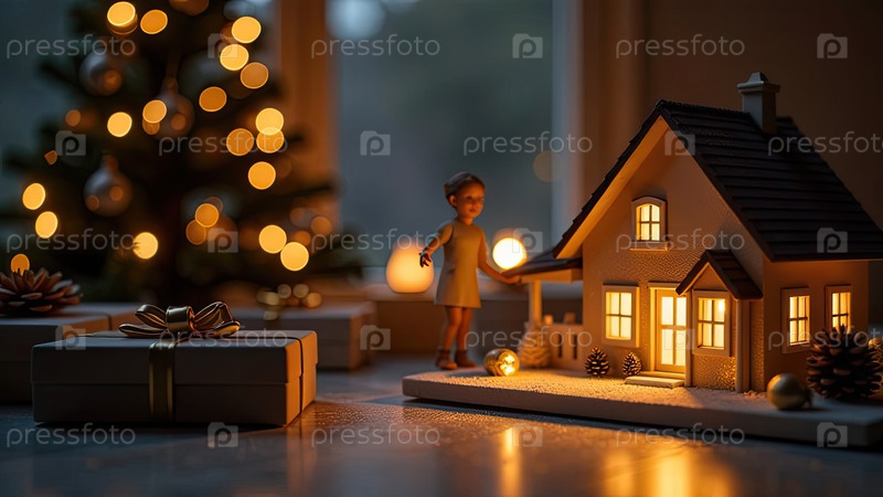 Прозрачное золото светящийся символ дома и коробка для подарков под елкой на рождественском фоне с золотым блеском