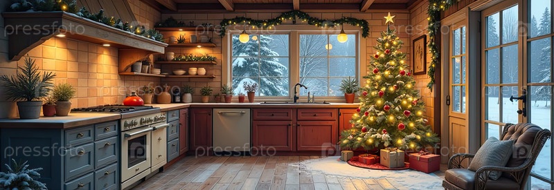 Рустический интерьер уютной рождественской кухни, новогоднее настроение, подготовка к празднику, посуда. Рождественский декор снежной кухни с приготовленным ужином. ИИ генерируется