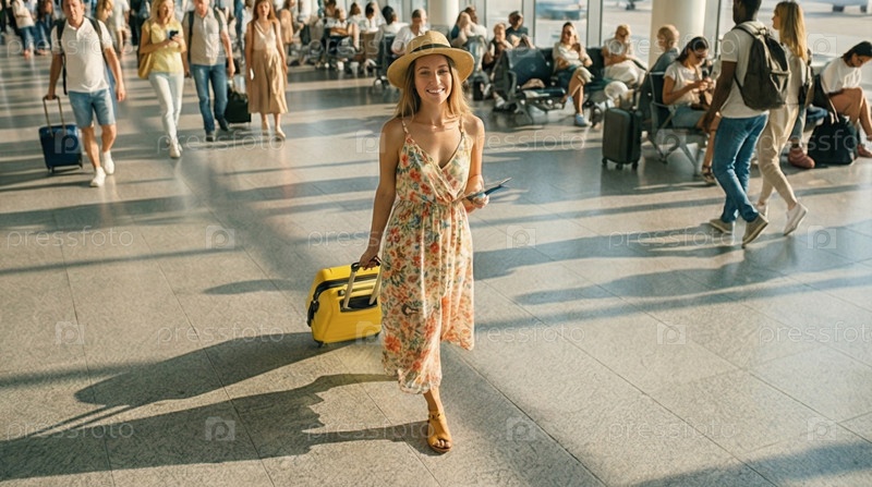 Женщина в бежевом пальто с желтым чемоданом, идущая по оживленному терминалу аэропорта, энергия путешествий, городское приключение, отпускная поездка, ожидание поездки