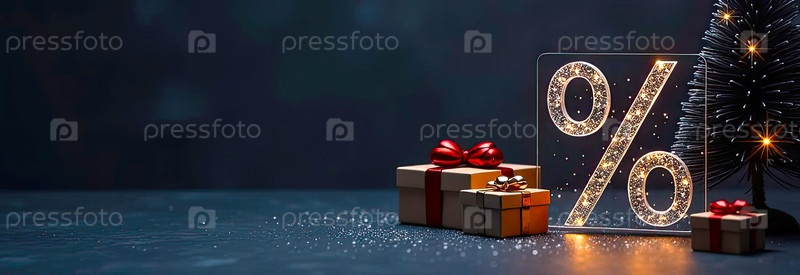 Неон светящийся золотой процентный знак на рождественском фоне с елкой, блесками и коробками для подарков. Черная пятница, Новый год, Рождественская распродажа, скидки. баннер, флаер с копировальным пространством. ИИ генерируется