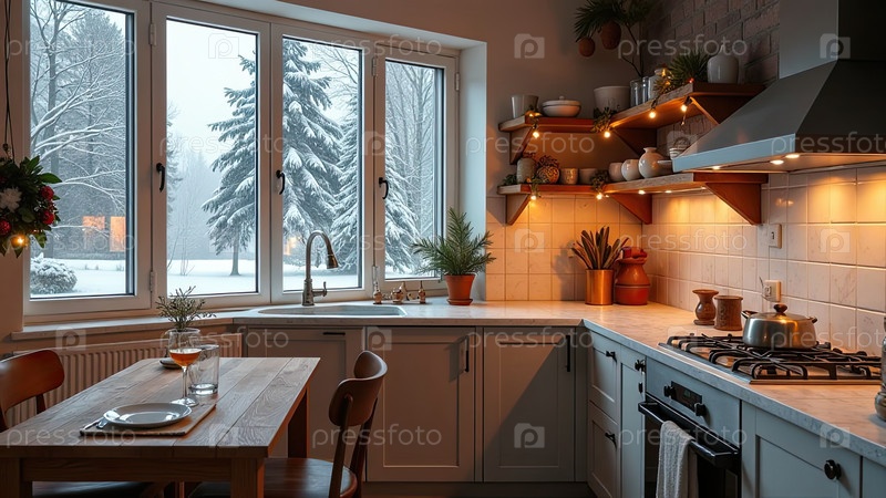 Верхний интерьер уютной современной рождественской кухни, новогоднее настроение, подготовка к празднику, посуда. Рождественский декор современной кухни, снег снаружи окна. ИИ генерируется