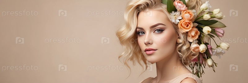 Блондинка с светлыми локонами и мягкой цветочной короной, бежевый фон, портрет весенней красоты, женственность, нежный праздник цветков, 8 марта, день женщин