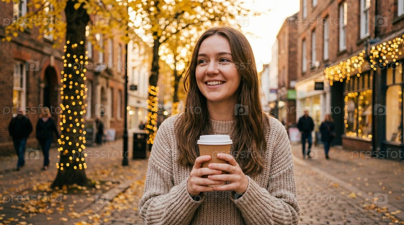 Счастливая женщина с кофе на вынос стоит на улице города, наслаждаясь кофе для ухода, осенней прогулкой, свежим воздухом, городским утренним образом жизни