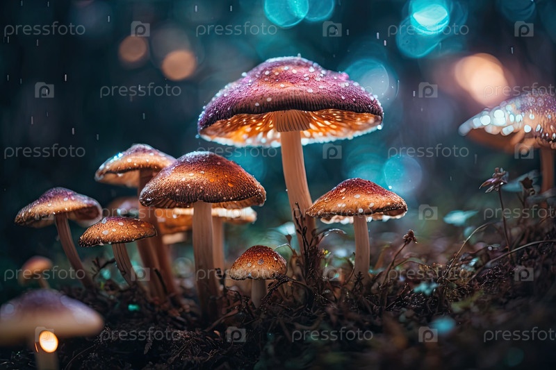 Группа волшебных грибов в фантастической обстановке, псилоцибин и психоактивное вещество, символизирующие зависимость, галлюцинации и альтернативные реальности